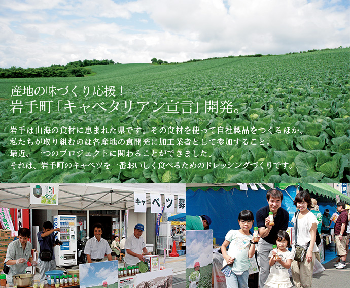 その後、岩手町では町をあげた取り組みがはじまり“キャベツの街を食から発信”するキャベツ関連の商品開発・販売展開を進めてきました。そして平成23年度には、「いわて春みどり」の良さをより知っていただき、地元の味を全国に発信していくことをねらいにご当地ドレッシングの開発がスタート。浅沼醤油店もそのプロジェクトに加えていただいたのです。「岩手町の人々に愛される味=全国に発信できる味」を目指し、まずは、市販のキャベツ向け調味料を集めて試食、メンバーでいわて春みどりに合う味の方向性を検討。さらに、7月~9月にかけ岩手町の皆さんが集まる機会に3回、のべ2000人への試食アンケートを実施し、味の改良を進めました。アンケートで地元の声を集めたことで、町民の方々も参加者意識が高まりドレッシングづくりへの思いが強くなったようです。そして主役であるキャベツの甘みを活かすことを大事に考えた結果できたのが、醤油を使わない塩ニンニク味のドレッシングです。醤油屋にも関わらず…(笑)。